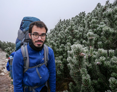 La journée commence rudement dans la fraîcheur et le gel. Rien de tel alors qu’une montée sur un petit sentier (avec quelques passages "touchy") pour se réchauffer et atteindre la barre des 2000m. Nous arrivons au milieu d’un spectacle blanc… les sapins sont recouverts de gel et le brouillard dense en contrebas.
