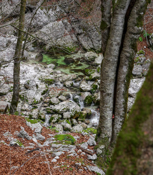 Depuis le parking de la cascade de Slavica commence la montée vers le refuge Dom na Komni (1520) à travers la forêt en lacets sinueux surplombant le lac.